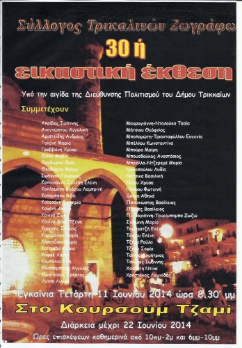 Εγκαινιάζεται την Τετάρτη 11 Ιουνίου 2014 στις 8.30 μμ η 30ή μεγάλη Εικαστική Έκθεση του Συλλόγου Τρικαλινών Ζωγράφων, στο «Κουρσούμ Τζαμί» υπό την Αιγίδα της Διεύθυνσης Παιδείας και Πολιτισμού του Δήμου Τρικκαίων.