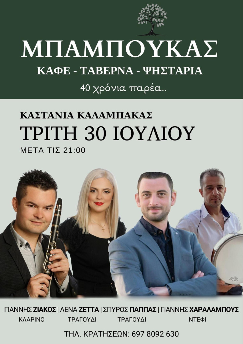 Την Τρίτη 30/7 στην Ταβέρνα “ΜΠΑΜΠΟΥΚΑΣ” ο Σπύρος Παππάς, η Ζέττα Λένα και ο Γιάννης Ζιάκος Ανακοινώσεις Από admin Δημοσίευση Ιούλ 29, 2024 -10:20 0 561 Κοινοποίηση FacebookTwitterΗλεκτρονικό ΤαχυδρομείοViber Μια μεγάλη βραδιά διασκέδασης χαρίζει το βράδυ της Τρίτης 30 Ιουλίου η Ταβέρνα ΜΠΑΜΠΟΥΚΑΣ στην Καστανιά Καλαμπάκας με τους μοναδικούς, Σπύρο Παππά, Ζέτα Λένα και Γιάννη Ζιάκο. Τηλ. κρατήσεων 6978 092630 0 561 Κοινοποίηση