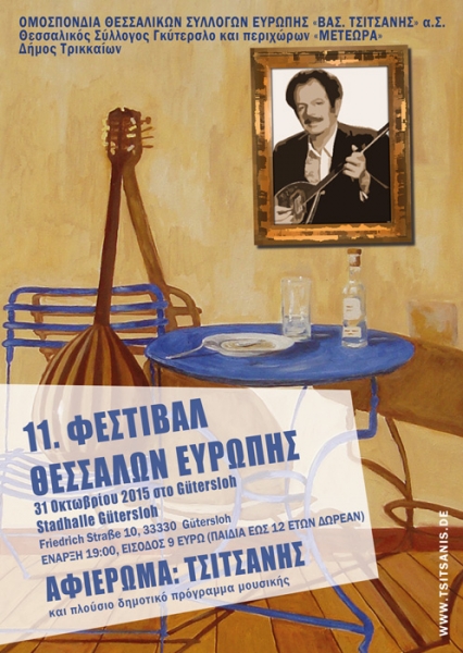 Η Ομοσπονδία Θεσσαλικών Συλλόγων Γερμανίας και άλλων κρατών Ευρώπης «ΒΑΣΙΛΗΣ ΤΣΙΤΣΑΝΗΣ» α.Σ. , ο Θεσσαλικός Σύλλογος Γκύτερσλο με τη συμμετοχή των Συλλόγων-Μελών (Μονάχου, Κολωνίας, Βισμπάντεν, Ελβετία, Ντύσσελντορφ, Σβάινφουρτ, Βερολίνο και Μπίλεφελντ) και ο Δήμος Τρικκαίων διοργανώνουν εκ κοινού το 11ο Φεστιβάλ Θεσσαλών Ευρώπης στο Γκύτερσλο το Φθινόπωρο 2015.