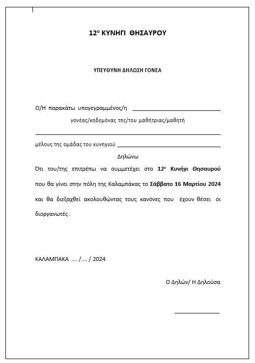Οι δηλώσεις συμμετοχής στο 12ο Κυνήγι θησαυρού 2024 θα γίνονται στο γραφείο του Θεατρικού Εργαστηρίου ¨Επί Σταγών¨, στο κτήριο του πρώην Κ.Ε.Γ.Ε Καλαμπάκας και ώρες 19:00 μέχρι 22:00 καθημερινά.