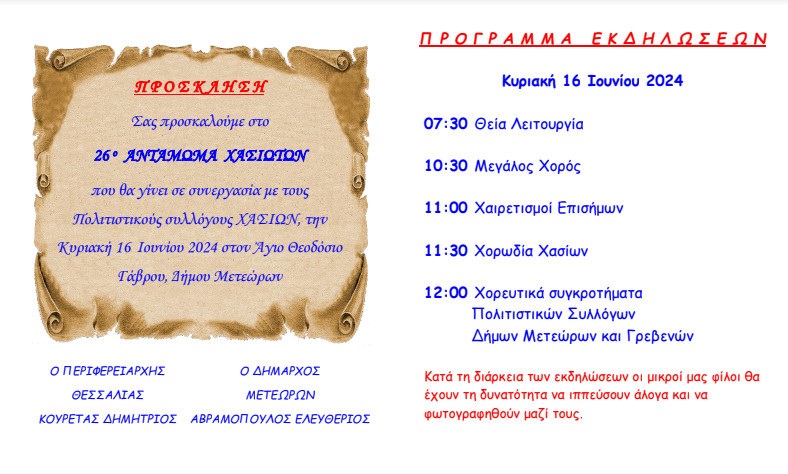 Την Κυριακή 16 Ιουνίου 2024 ο Δήμος Μετεώρων σε συνεργασία με την Περιφέρεια Θεσσαλίας και τους Πολιτιστικούς Συλλόγους Χασίων διοργανώνουν το 26ο Αντάμωμα Χασιωτών στον Άγιο Θεοδόσιο Γάμβρου.