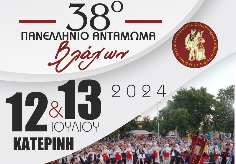 Η Πανελλήνια Ομοσπονδία Πολιτιστικών Συλλόγων Βλάχων διοργανώνει το 38ο Πανελλήνιο Αντάμωμα Βλάχων στις 12 & 13 Ιουλίου 2024 στην Κατερίνη υπό την αιγίδα της Περιφέρειας Κεντρικής Μακεδονίας με συνδιοργανωτές την Περιφερειακή Ενότητα Πιερίας και το Δήμο Κατερίνης, και τους συλλόγους : ΚΟΚΚΙΝΟΠΛΙΤΩΝ Ν. ΠΙΕΡΙΑΣ – ΛΙΒΑΔΙΩΤΩΝ ΚΑΤΕΡΙΝΗΣ – ΚΑΡΙΤΣΑΣ – ΑΓΙΟΥ ΣΠΥΡΙΔΩΝΑ – ΦΤΕΡΗΣ ΠΙΕΡΙΑΣ