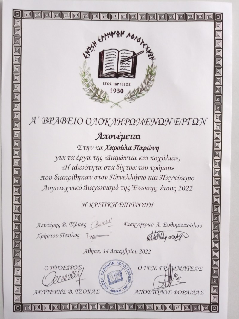 Η κα Παρώνη έλαβε το βραβείο για τα έργα της “Διαμάντια και Κοχύλια” και “Η αθωότητα στα δίχτυα του τρόμου” που διακρίθηκαν στον Πανελλήνιο και Παγκύπριο Λογοτεχνικό διαγωνισμό Ευρώπης 2022.