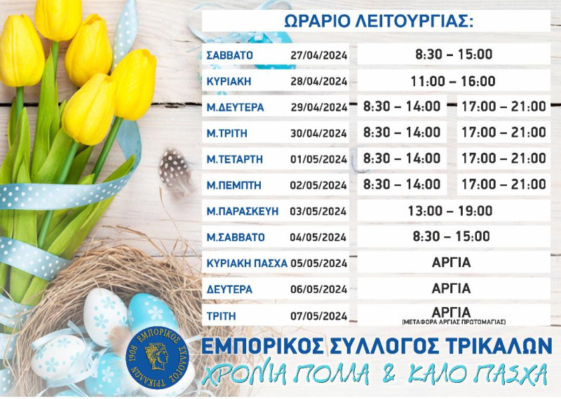 Ο Εμπορικός Σύλλογος Τρικάλων ενημερώνει τους συναδέλφους και το καταναλωτικό κοινό ότι το προτεινόμενο εορταστικό ωράριο των καταστημάτων για την περίοδο του Πάσχα, από το Σάββατο 27 Απριλίου 2024 έως την Τρίτη 7 Μαΐου 2024, έχει ως εξής: