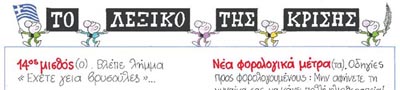Αρκετά είναι τα δημοσιεύματα και οι γελοιογραφίες που διακωμωδούν την όλη κατάσταση με την οικονομία μας που περνάει δύσκολες μέρες. Επίσης αρκετά είναι τα e-mail που μας έρχονται καθημερινά από αυτά τα δημοσιεύματα και σας μεταφέρουμε το “λεξικό της κρίσης” όπως το έχουνε ονομάσει. Δείτε το πως έχει: