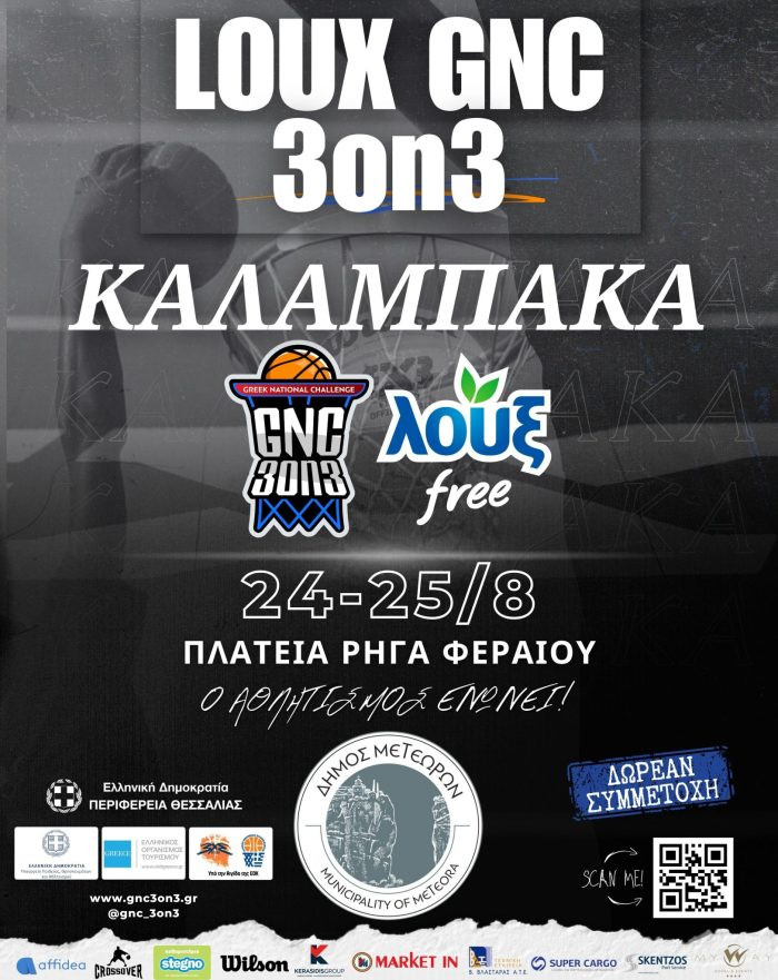 Ένα μοναδικό μπασκετικό event, έρχεται για δύο ημέρες στο κέντρο της Καλαμπάκας! Το LOUX GNC 3on3 | ΚΑΛΑΜΠΑΚΑ 2024, διεξάγεται το διήμερο 24-25 Αυγούστου στην Κεντρική Πλατεία «Ρήγα Φεραίου», της Καλαμπάκας και αποτελεί μία συνδιοργάνωση του Δήμου Μετεώρων και του GNC 3on3, υπό την αιγίδα του Υπουργείου Παιδείας, Θρησκευμάτων και Αθλητισμού, του Ελληνικού Οργανισμού Τουρισμού και της Ελληνικής Ομοσπονδίας Καλαθοσφαίρισης.