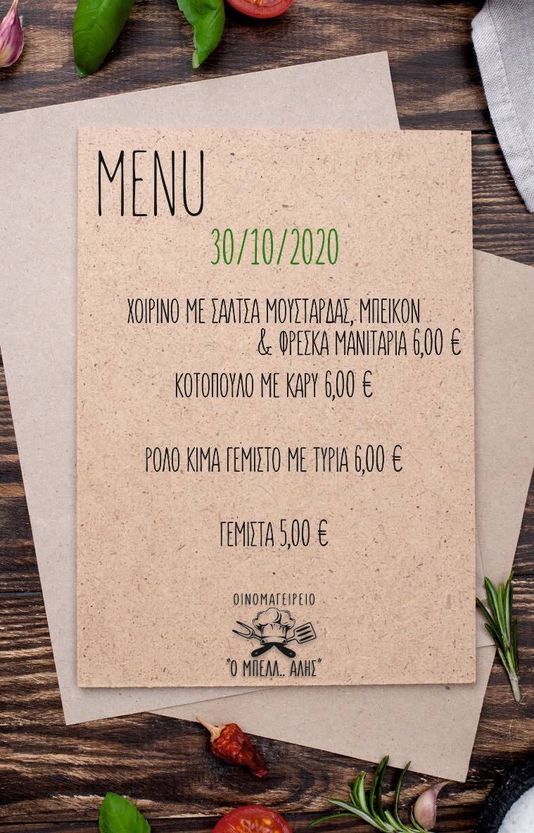 Το μενού για σήμερα Παρασκευή 30/10 στο Οινομαγειρείο Ο “ΜΠΕΛΛ…ΑΛΗΣ”