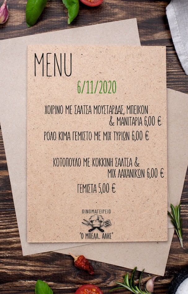 Το μενού για σήμερα Παρασκευή 6/11 στο Οινομαγειρείο Ο “ΜΠΕΛΛ…ΑΛΗΣ” Ανακοινώσεις Από admin Δημοσίευση Νοέ 6, 2020 -8:18 0 382 Κοινοποίηση FacebookTwitterΗλεκτρονικό ΤαχυδρομείοViber Το Οινομαγειρείο ” Ο ΜΠΕΛΛ..ΑΛΗΣ” στην Καλαμπάκα που βρίσκεται στην οδό Ράμμου 16 προτείνει για σήμερα Παρασκευή 6 Νοεμβρίου, τα εξής μαγειρευτά φαγητά τα οποία έρχονται στο σπίτι σας – delivery – με ένα τηλεφώνημα στο τηλ.: 24320 77909. 0 382 Κοινοποίηση