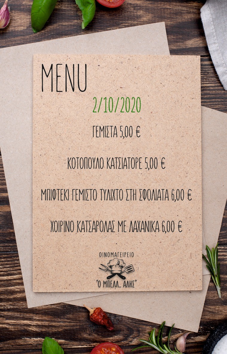 Το μενού για σήμερα Παρασκευή στο Οινομαγειρείο Ο “ΜΠΕΛΛ…ΑΛΗΣ” Ανακοινώσεις Από admin Δημοσίευση Οκτ 2, 2020 -8:20 0 558 Κοινοποίηση FacebookTwitterΗλεκτρονικό ΤαχυδρομείοViber Το Οινομαγειρείο ” Ο ΜΠΕΛΛ..ΑΛΗΣ” στην Καλαμπάκα που βρίσκεται στην οδό Ράμμου 16 προτείνει για σήμερα Παρασκευή 2 Οκτωβρίου, τα εξής μαγειρευτά φαγητά τα οποία έρχονται στο σπίτι σας – delivery – με ένα τηλεφώνημα στο τηλ.: 24320 77909. 0 558 Κοινοποίηση