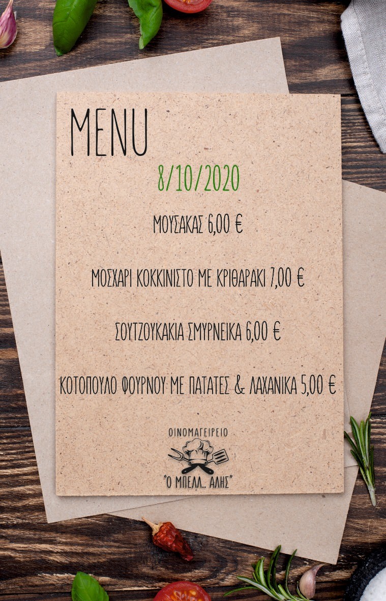 Το μενού για σήμερα Πέμπτη στο Οινομαγειρείο Ο “ΜΠΕΛΛ…ΑΛΗΣ” Ανακοινώσεις Από admin Δημοσίευση Οκτ 8, 2020 -8:15 0 570 Κοινοποίηση FacebookTwitterΗλεκτρονικό ΤαχυδρομείοViber Το Οινομαγειρείο ” Ο ΜΠΕΛΛ..ΑΛΗΣ” στην Καλαμπάκα που βρίσκεται στην οδό Ράμμου 16 προτείνει για σήμερα Πέμπτη 8 Οκτωβρίου, τα εξής μαγειρευτά φαγητά τα οποία έρχονται στο σπίτι σας – delivery – με ένα τηλεφώνημα στο τηλ.: 24320 77909. 0 570 Κοινοποίηση