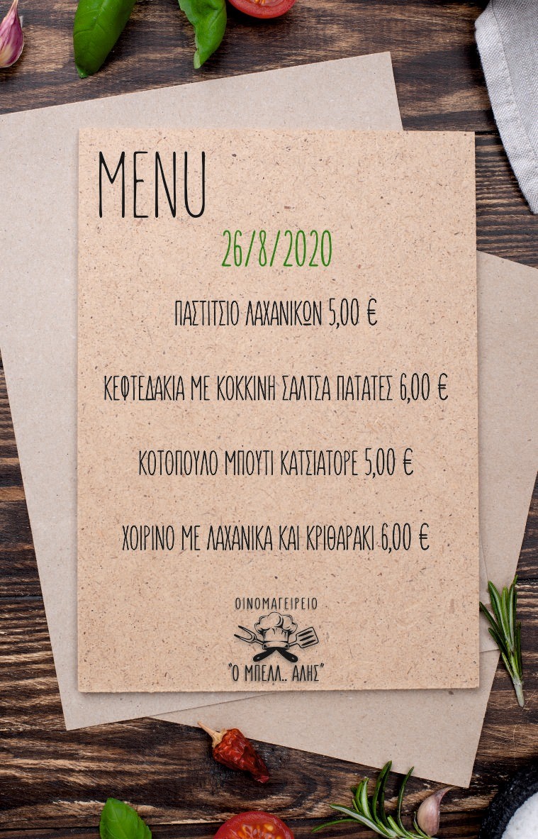 Το μενού για σήμερα Τετάρτη στο Οινομαγειρείο Ο “ΜΠΕΛΛ…ΑΛΗΣ” Ανακοινώσεις Από admin Δημοσίευση Αυγ 26, 2020 -8:11 0 536 Κοινοποίηση FacebookTwitterΗλεκτρονικό ΤαχυδρομείοViber Το Οινομαγειρείο ” Ο ΜΠΕΛΛ..ΑΛΗΣ” στην Καλαμπάκα που βρίσκεται στην οδό Ράμμου 16 προτείνει για σήμερα Τετάρτη 26 Αυγούστου, τα εξής μαγειρευτά φαγητά τα οποία έρχονται στο σπίτι σας – delivery – με ένα τηλεφώνημα στο τηλ.: 24320 77909. 0 536 Κοινοποίηση