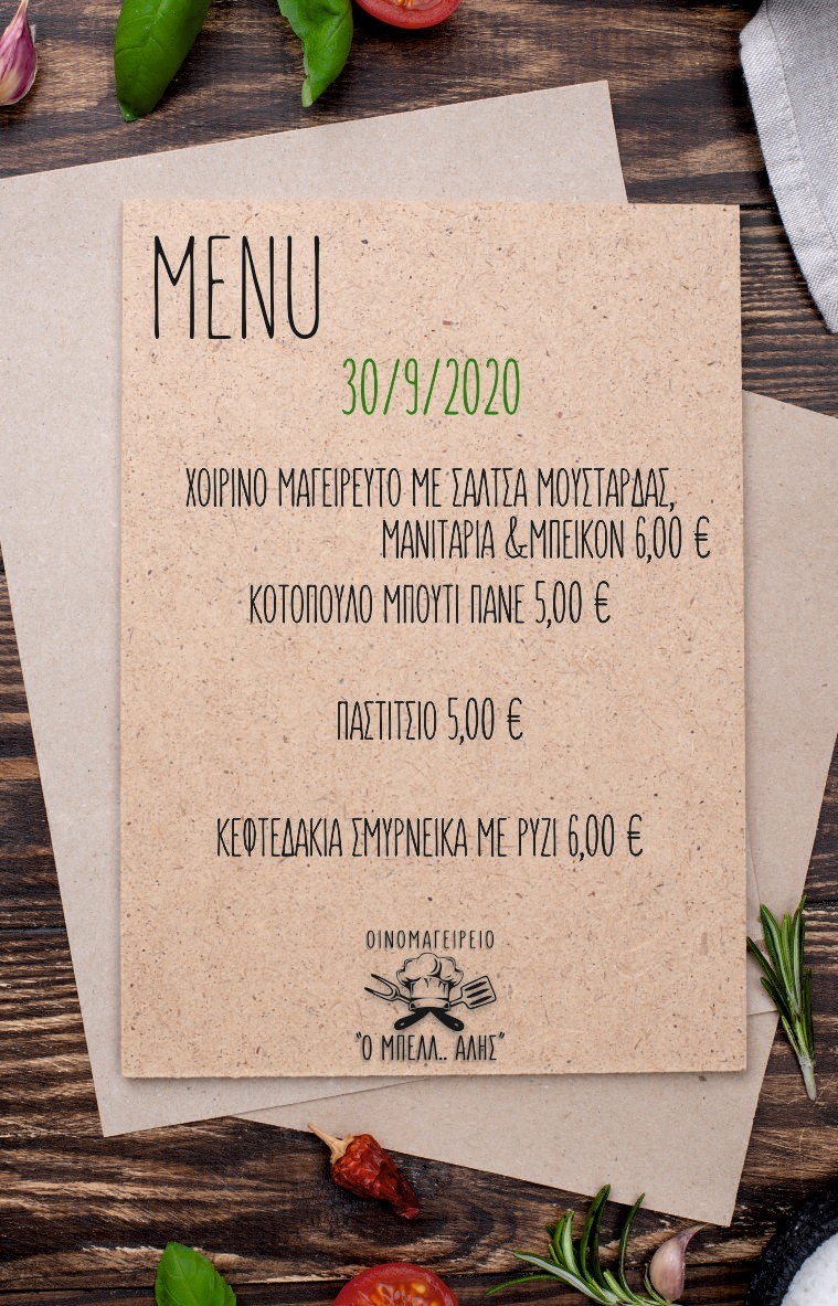Το μενού για σήμερα Τετάρτη στο Οινομαγειρείο Ο “ΜΠΕΛΛ…ΑΛΗΣ” Ανακοινώσεις Από admin Δημοσίευση Σεπ 30, 2020 -8:15 0 478 Κοινοποίηση FacebookTwitterΗλεκτρονικό ΤαχυδρομείοViber Το Οινομαγειρείο ” Ο ΜΠΕΛΛ..ΑΛΗΣ” στην Καλαμπάκα που βρίσκεται στην οδό Ράμμου 16 προτείνει για σήμερα Τετάρτη 30 Σεπτεμβρίου, τα εξής μαγειρευτά φαγητά τα οποία έρχονται στο σπίτι σας – delivery – με ένα τηλεφώνημα στο τηλ.: 24320 77909. 0 478 Κοινοποίηση