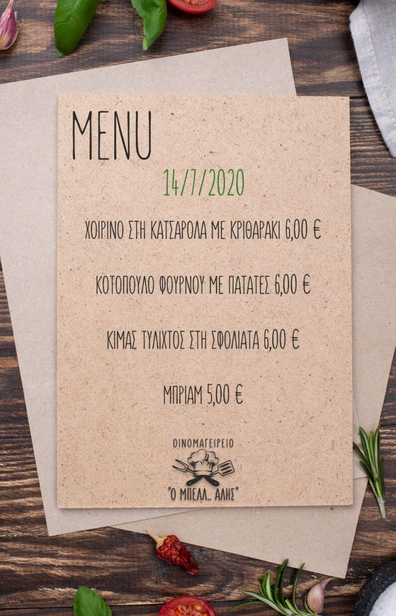 Το Οινομαγειρείο ” Ο ΜΠΕΛΛ..ΑΛΗΣ” στην Καλαμπάκα που βρίσκεται στην οδό Ράμμου 16 προτείνει για σήμερα Τρίτη 14 Ιουλίου, τα εξής μαγειρευτά φαγητά τα οποία έρχονται στο σπίτι σας – delivery – με ένα τηλεφώνημα στο τηλ.: 24320 77909.