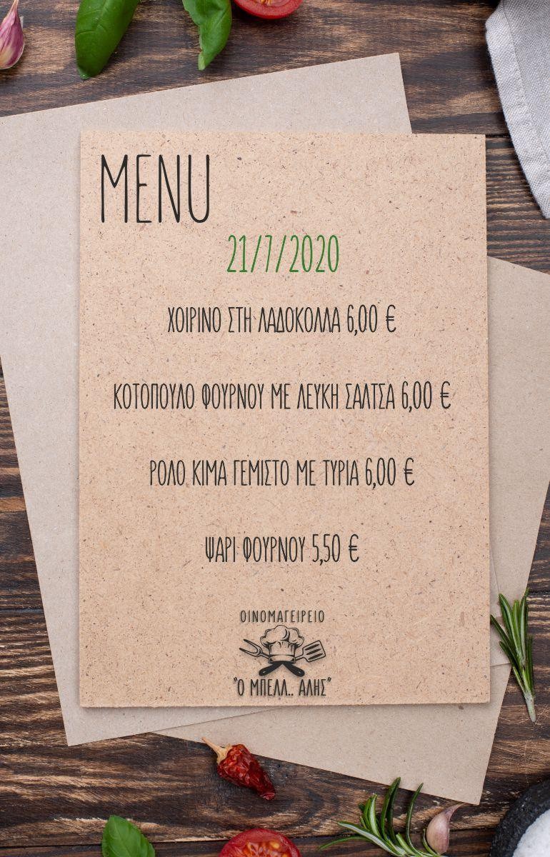 Το Οινομαγειρείο ” Ο ΜΠΕΛΛ..ΑΛΗΣ” στην Καλαμπάκα που βρίσκεται στην οδό Ράμμου 16 προτείνει για σήμερα Τρίτη 21 Ιουλίου, τα εξής μαγειρευτά φαγητά τα οποία έρχονται στο σπίτι σας – delivery – με ένα τηλεφώνημα στο τηλ.: 24320 77909.