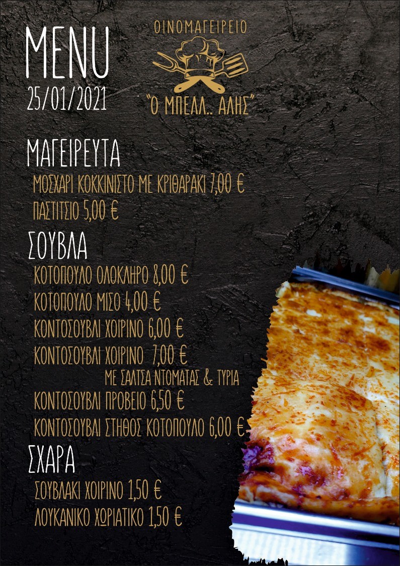 Το Οινομαγειρείο  “Ο ΜΠΕΛΛ.. ΑΛΗΣ” της Καλαμπάκας με το ποιοτικό φαγητό και τις ξεχωριστές του προτάσεις και σήμερα είναι κοντά σας με νέο μενού.