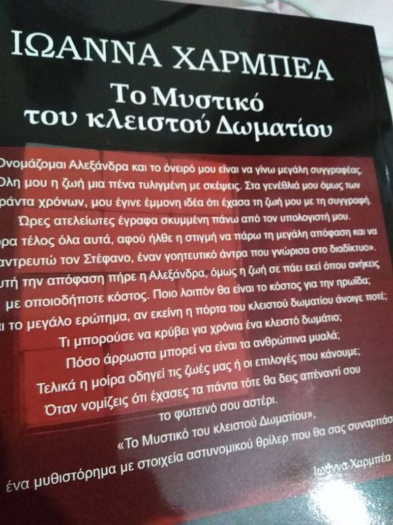 Κοιτάζεις γύρω γύρω πριν φύγεις θέλεις να αποτυπώσεις κάθε συναίσθημα, κάθε στιγμή, κάθε εικόνα …τίποτα δεν χάνεται αν το αποτυπώσουμε σε χαρτί , πόσο μάλλον αν το φτιάξουμε βιβλίο.. Έτσι λοιπόν έγινε και το βιβλίο μου το μυστικό του κλειστού δωματίου. Περίληψη: “Ονομάζομαι Αλεξάνδρα και το όνειρό μου είναι να γίνω μεγάλη συγγραφέας. Όλη μου η ζωή μια πένα τυλιγμένη με σκέψεις. Στα γενέθλιά μου όμως των σαράντα χρόνων, μου έγινε έμμονη ιδέα ότι έχασα τη ζωή μου με τη συγγραφή. Ώρες ατελείωτες έγραφα σκυμμένη πάνω από τον υπολογιστή μου. Τώρα τέλος όλα αυτά, αφού ήλθε η στιγμή να πάρω τη μεγάλη απόφαση και να παντρευτώ τον Στέφανο, έναν γοητευτικό άντρα που γνώρισα στο διαδίκτυο”. Αυτή την απόφαση πήρε η Αλεξάνδρα, όμως η ζωή σε πάει εκεί όπου ανήκεις με οποιοδήποτε κόστος. Ποιο λοιπόν θα είναι το κόστος για την ηρωίδα; Και το μεγάλο ερώτημα, αν εκείνη η πόρτα του κλειστού δωματίου άνοιγε ποτέ; Τι μπορούσε να κρύβει για χρόνια ένα κλειστό δωμάτιο; Πόσο άρρωστα μπορεί να είναι τα ανθρώπινα μυαλά; Τελικά η μοίρα οδηγεί τις ζωές μας ή οι επιλογές που κάνουμε; Όταν νομίζεις ότι έχασες τα πάντα τότε θα δεις απέναντί σου το φωτεινό σου αστέρι.