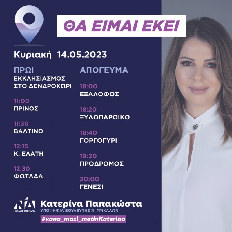 Την Κυριακή, 14 Μαΐου 2023, η Υποψήφια Βουλευτής της Νέας Δημοκρατίας, Κατερίνα Παπακώστα, θα βρίσκεται το πρωί στο Δενδροχώρι για τον εκκλησιασμό και στη συνέχεια θα μεταβεί στο Πρίνος, το Βαλτινό, την Κ. Ελάτη και τη Φωτάδα. Το απόγευμα θα επισκεφθεί τον Εξάλοφο, το Ξυλοπάροικο, το Γοργογύρι, τον Πρόδρομο και το Γενέσι.