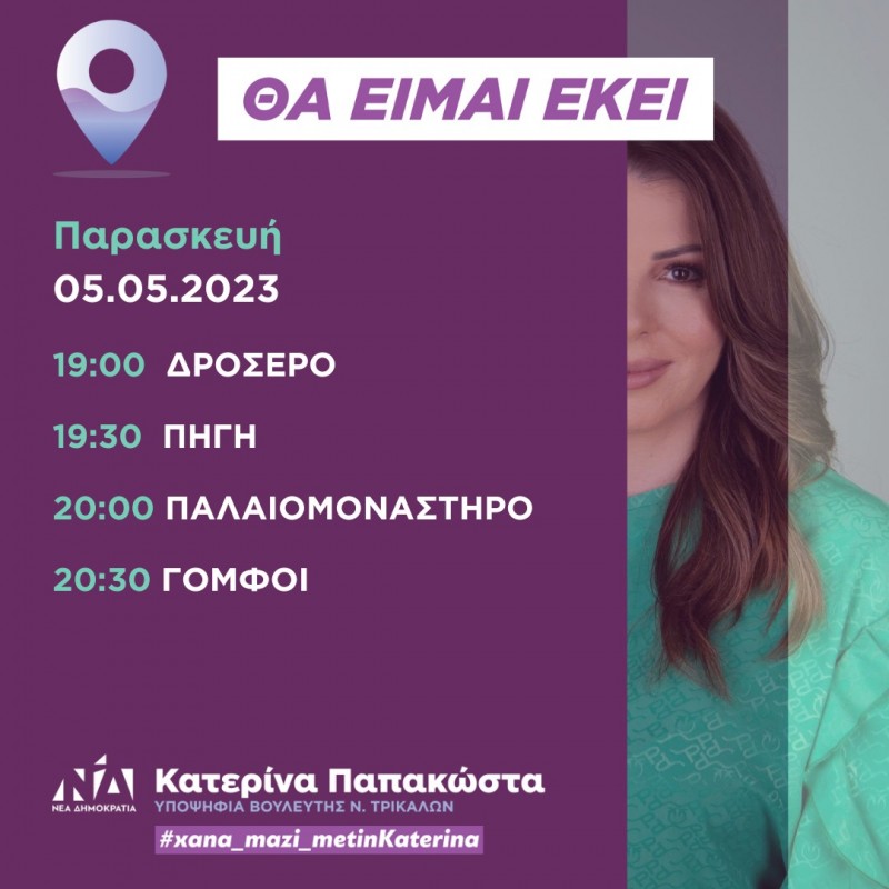 Την Παρασκευή, 5 Μαΐου 2023, η Υποψήφια Βουλευτής της Νέας Δημοκρατίας, Κατερίνα Παπακώστα, θα επισκεφθεί το Δροσερό, την Πηγή, το Παλαιομονάστηρο και τους Γόμφους.