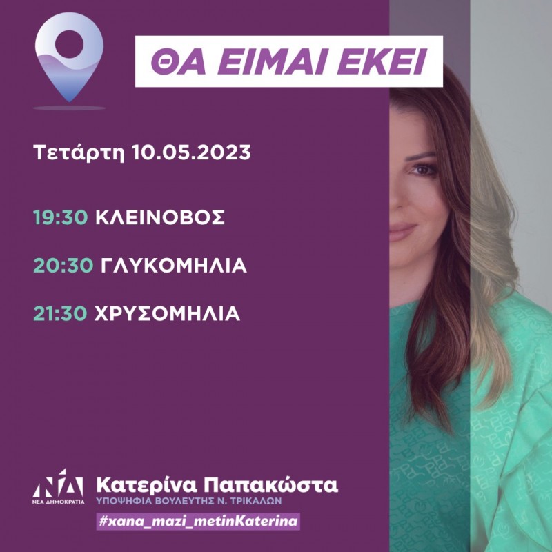 Την Τετάρτη, 10 Μαΐου 2023, η Υποψήφια Βουλευτής της Νέας Δημοκρατίας, Κατερίνα Παπακώστα, θα επισκεφθεί τον Κλεινοβό, τη Γλυκομηλιά και την Χρυσομηλιά.