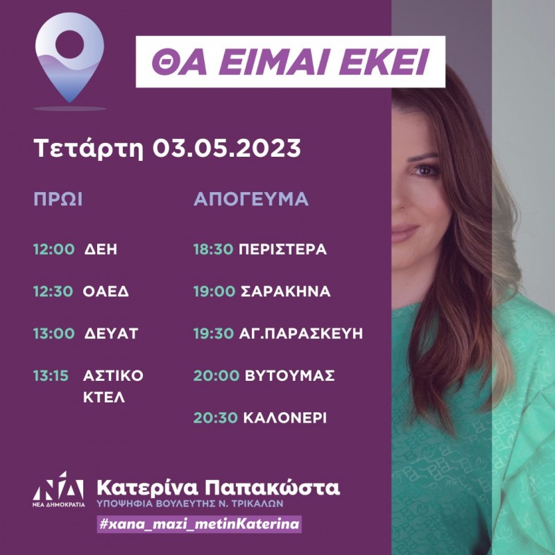 Την Τετάρτη, 3 Μαΐου 2023, το πρωί, η Υποψήφια Βουλευτής της Νέας Δημοκρατίας, Κατερίνα Παπακώστα, θα επισκεφθεί δημόσιες υπηρεσίες των Τρικάλων, ενώ το απόγευμα, θα μεταβεί στα χωριά Περιστέρα, Σαρακήνα, Αγ. Παρασκευή, Βυτουμά και Καλονέρι.