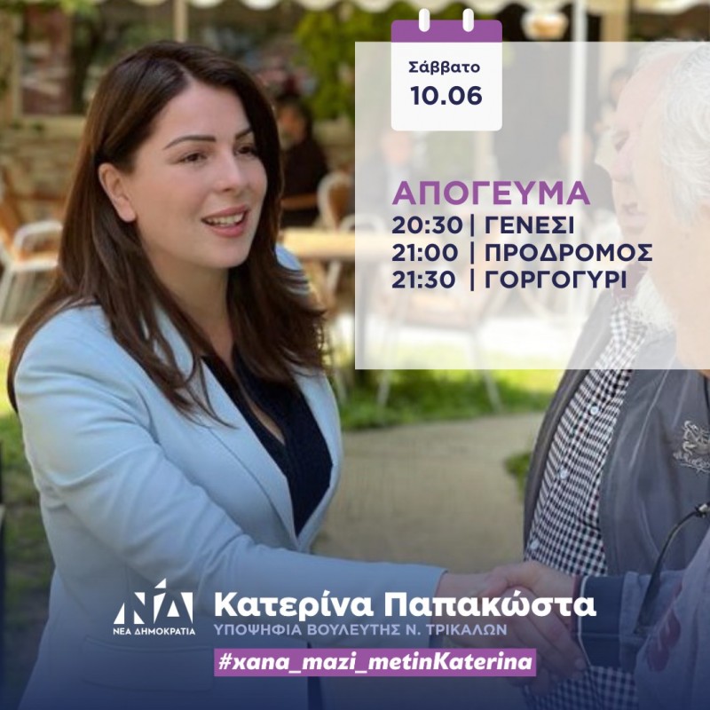 Το Σάββατο, 10 Ιουνίου 2023, η Υποψήφια Βουλευτής της Νέας Δημοκρατίας, Κατερίνα Παπακώστα, θα επισκεφθεί το απόγευμα τον Γενέσι, τον Πρόδρομο και το Γοργογύρι.