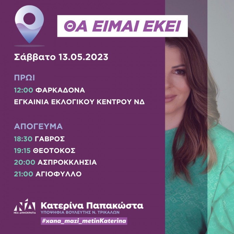 Το Σάββατο, 13 Μαΐου 2023, η Υποψήφια Βουλευτής της Νέας Δημοκρατίας, Κατερίνα Παπακώστα, θα παρευρεθεί το πρωί στα εγκαίνια του εκλογικού κέντρου της Νέας Δημοκρατίας, στη Φαρκαδόνα, και το απόγευμα θα επισκεφθεί τον Γάβρο, τη Θεοτόκο, την Ασπροκκλησιά και το Αγιόφυλλο.