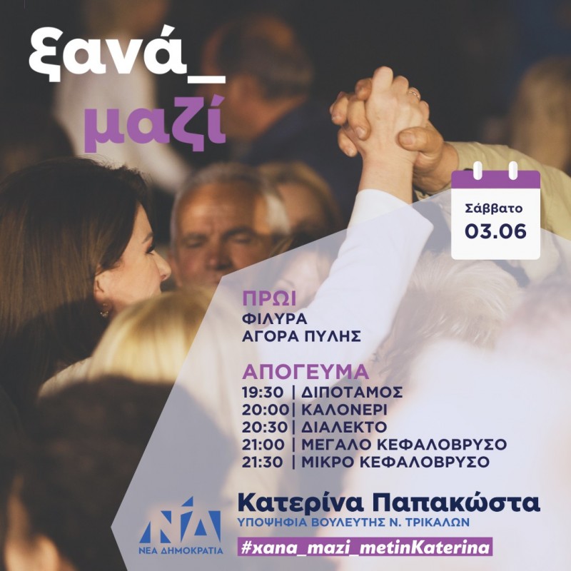 Το Σάββατο, 3 Ιουνίου 2023, η Υποψήφια Βουλευτής της Νέας Δημοκρατίας, Κατερίνα Παπακώστα, θα επισκεφθεί το πρωί τη Φιλύρα και την αγορά της Πύλης και το απόγευμα, το Καλονέρι, το Διαλεκτό, τον Διπόταμο, το Μικρό & Μεγάλο Κεφαλόβρυσο.