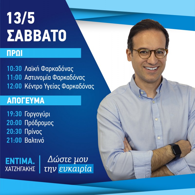 Ο υποψήφιος Βουλευτής της Ν.Δ. κ. Μικέλης Χατζηγάκης το Σάββατο 13 Μαίου 2023 θα επισκεφθει: