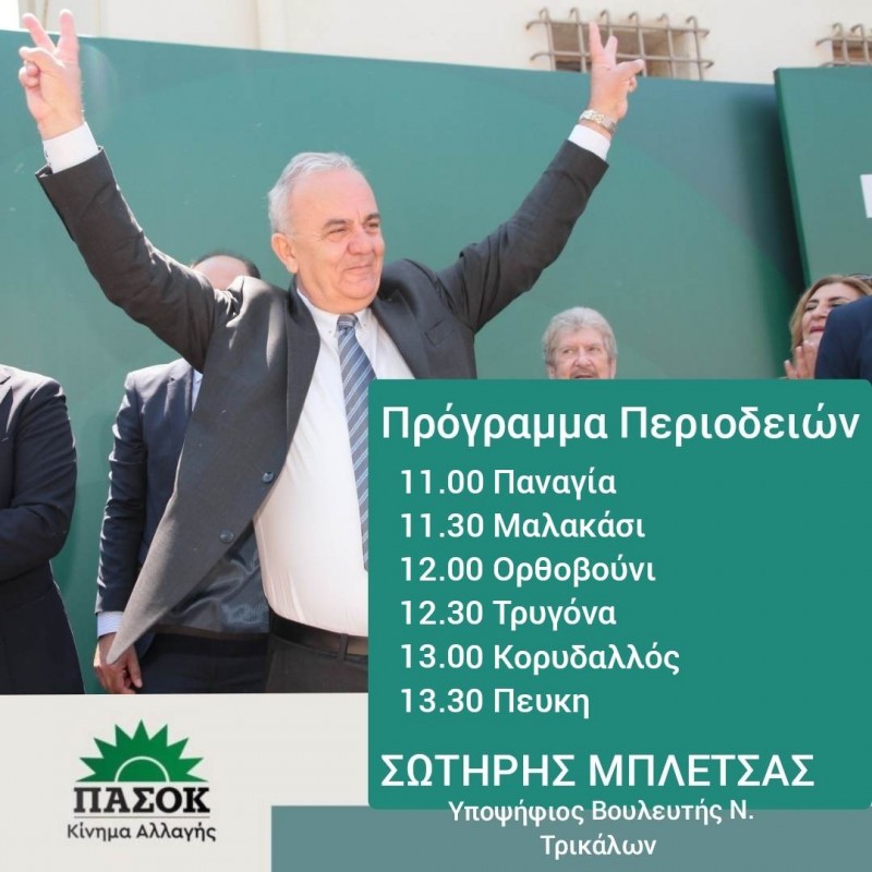 Ο υποψήφιος βουλευτής του ΠΑΣΟΚ στην Π.Ε. Τρικάλων, Σωτήρης Μπλέτσας την Σάββατο 13 Μαΐου, θα επισκεφθεί τα ακόλουθα χωριά: