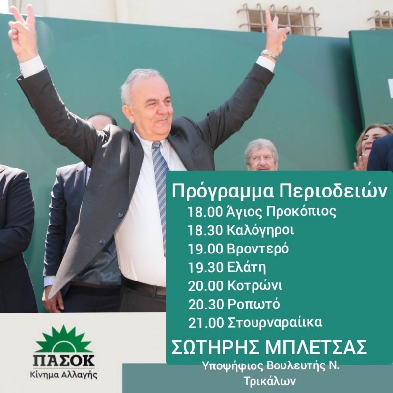 Ο υποψήφιος βουλευτής του ΠΑΣΟΚ στην Π.Ε. Τρικάλων, Σωτήρης Μπλέτσας την Πέμπτη 4 Μαΐου, το απόγευμα, θα επισκεφθεί τα ακόλουθα χωριά: