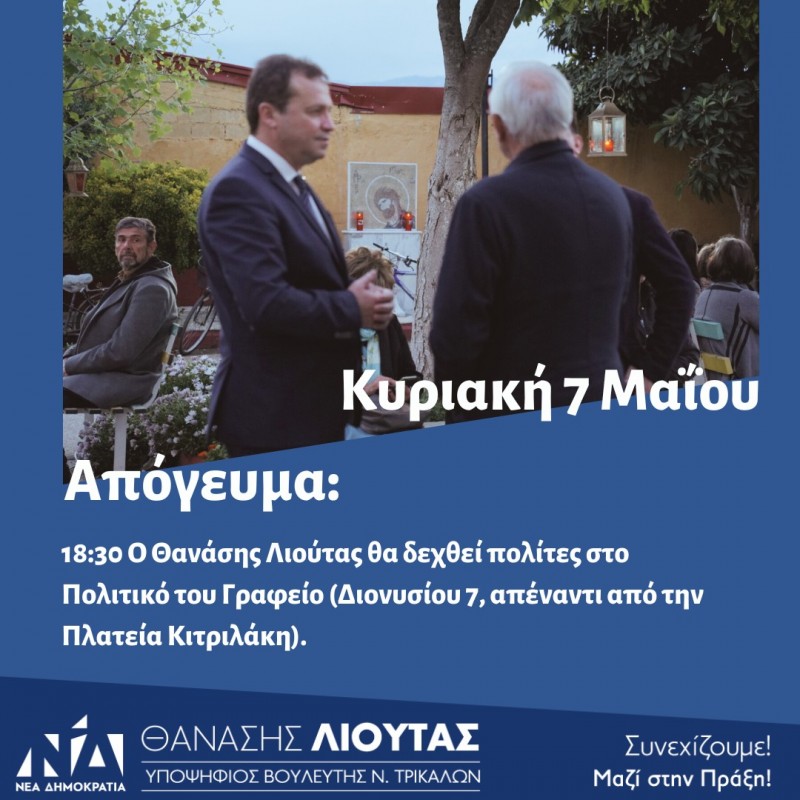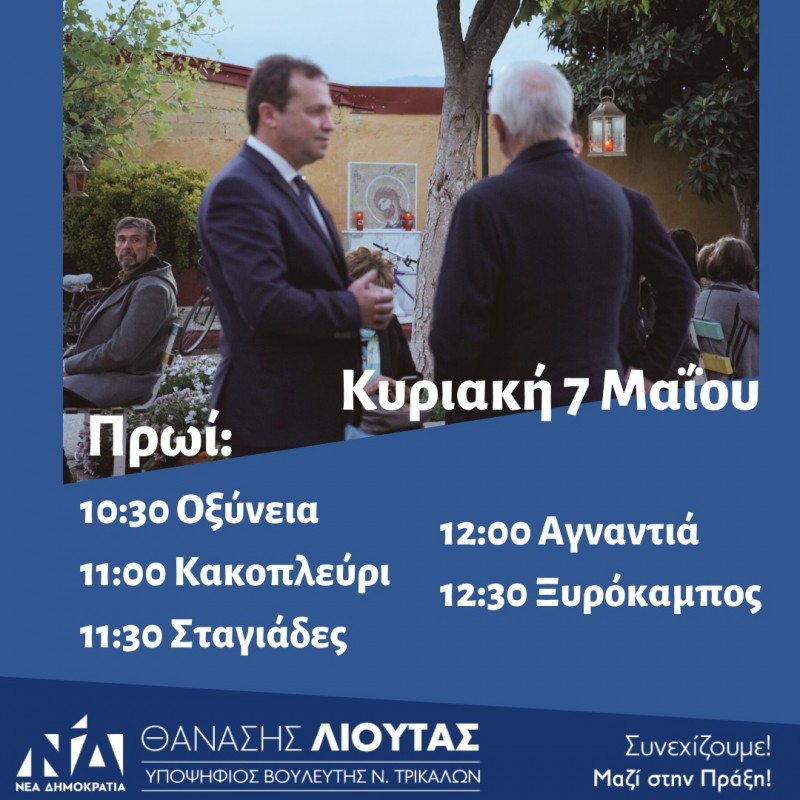 Το πρόγραμμα περιοδειών του Υποψήφιου Βουλευτή της Ν.Δ. στο Νομό Τρικάλων κ. Θανάση Λιούτα την Κυριακή 7/5 έχεις ως εξής: