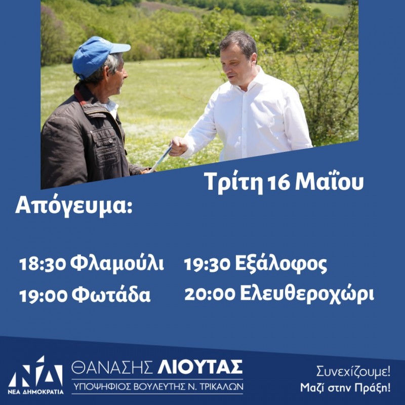 Το πρόγραμμα περιοδειών του Υποψήφιου Βουλευτή της Ν.Δ. Νομού Τρικάλων Θανάση Λιούτα την Τρίτη 16/5 έχει ως εξής:
