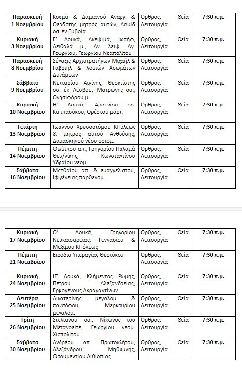 Το πρόγραμμα των Ιερών Ακολουθιών και Μυστηρίων στον Ιερό Ναό Αγίου Δημητρίου Διάβας για τον Νοέμβριο: