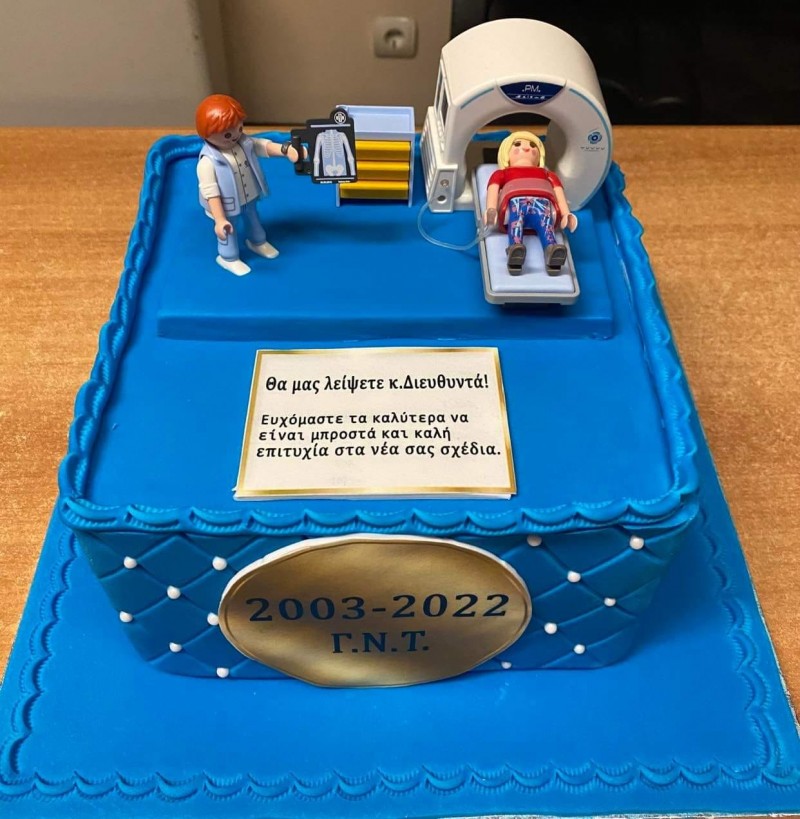 Το προσωπικό του Ακτινολογικού τμήματος με τούρτα εμπνευσμένη από τον ακτινολογικό χώρο ευχήθηκαν τα καλύτερα στον Διευθυντή τους ευχαριστώντας τον για την άψογη συνεργασία όλων αυτών των ετών.