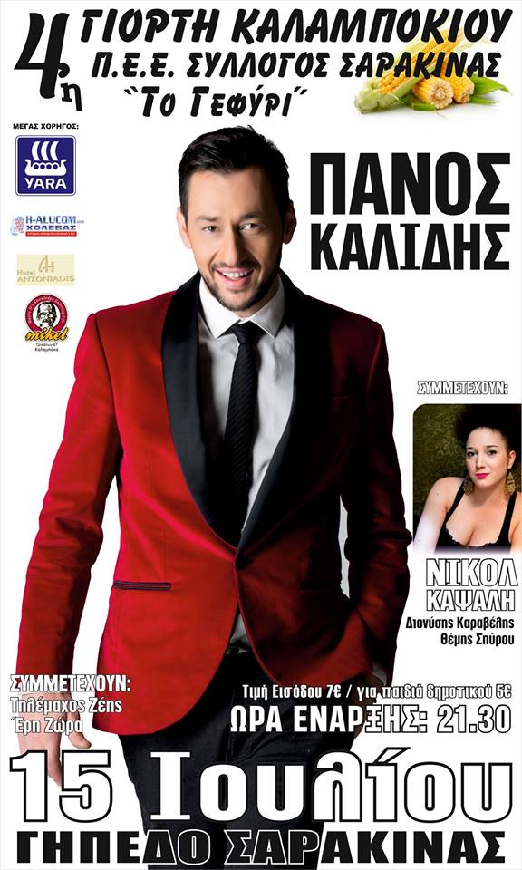 Ο Πολιτιστικός Σύλλογος Σαρακίνας το Σάββατο 15 Ιουλίου διοργανώνει την 4η Γιορτή Καλαμποκιού και εκτινάσσει τις προσδοκίες στα ύψη επιλέγοντας ένα από τα κορυφαία ονόματα της ελληνικής μουσικής για την διασκέδασή σας, τον Πάνο Καλλίδη.