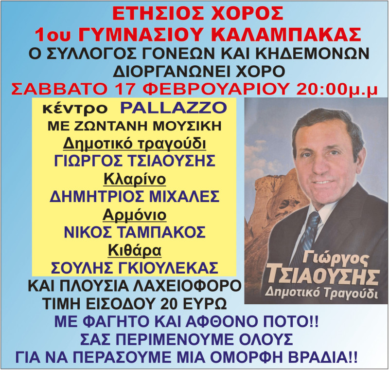 Ο Σύλλογος Γονέων και Κηδεμόνων του 1ου Γυμνασίου Καλαμπάκας διοργανώνει τον ετήσιο χορό το Σάββατο 17 Φεβρουαρίου και ώρα 20:00 στο Κέντρο PALAZZO.