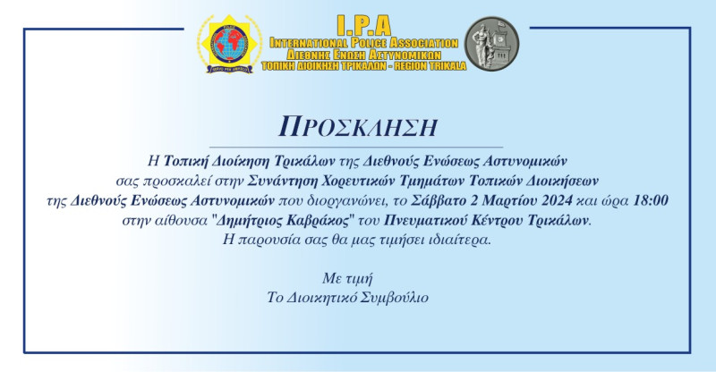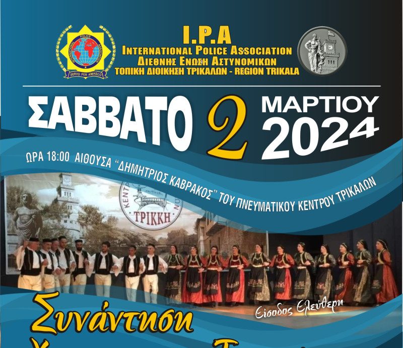 Η Τοπική Διοίκηση Τρικάλων της Διεθνούς Ενώσεως Αστυνομικών, θα πραγματοποιήσει το Σάββατο 2 Μαρτίου 2024 στο χώρο του Πνευματικού κέντρου Τρικάλων, την «1ηΣυνάντηση Χορευτικών της Διεθνούς Ενώσεως Αστυνομικών».