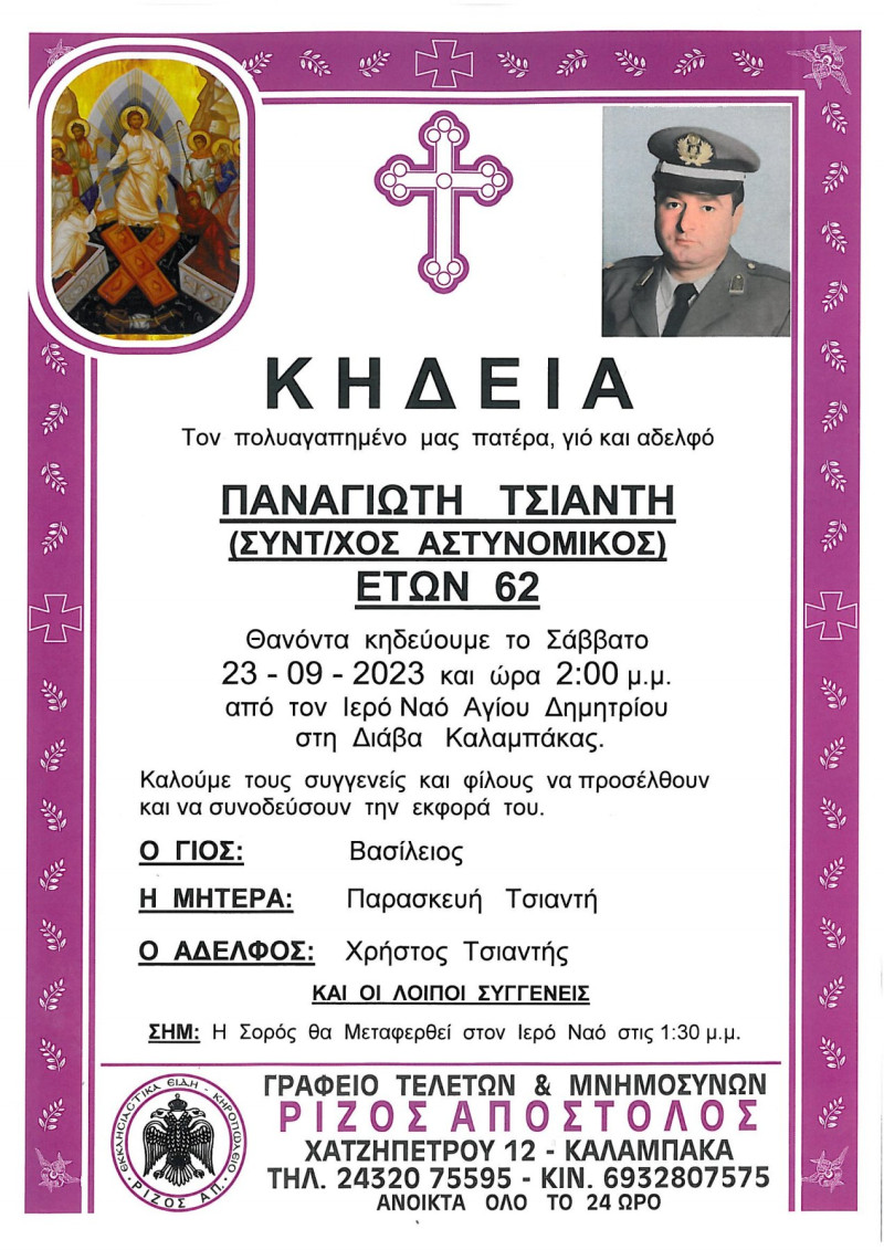 Τον πολυαγαπημένο μας πατέρα, γιό και αδελφό ΠΑΝΑΓΙΩΤΗ ΤΣΙΑΝΤΗ (ΣΥΝΤ/ΧΟΣ ΑΣΤΥΝΟΜΙΚΟΣ) ΕΤΩΝ 62 Θανόντα κηδεύουμε το Σάββατο 23 – 09 – 2023 και ώρα 2:00 μ.μ. από τον Ιερό Ναό Αγίου Δημητρίου στη Διάβα Καλαμπάκας.