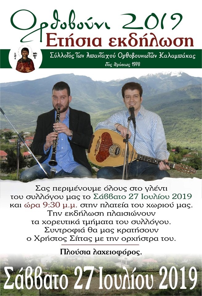 Ο Σύλλογος Απανταχού Ορθοβουνιωτών Καλαμπάκας σας καλεί όλους στην ετήσια εκδήλωση το Σάββατο 27 Ιουλίου στις 9:30 το βράδυ στην πλατεία του χωριού.