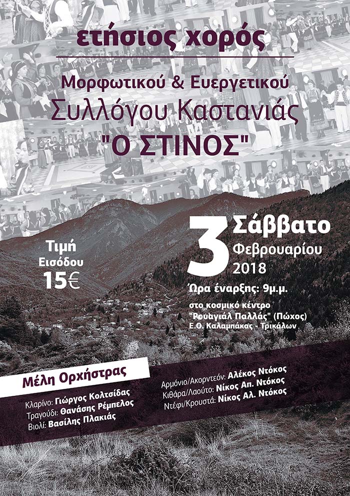Ο Μορφωτικός & Ευεργετικός Σύλλογος Καστανιάς «Ο ΣΤΙΝΟΣ» σας προσκαλεί στον ετήσιο χορό  του που διοργανώνει το Σάββατο 03 Φεβρουαρίου 2018 στο κοσμικό κέντρο «Royal Palace – Πώχος» επί του 2ου χλμ Καλαμπάκας – Τρικάλων.