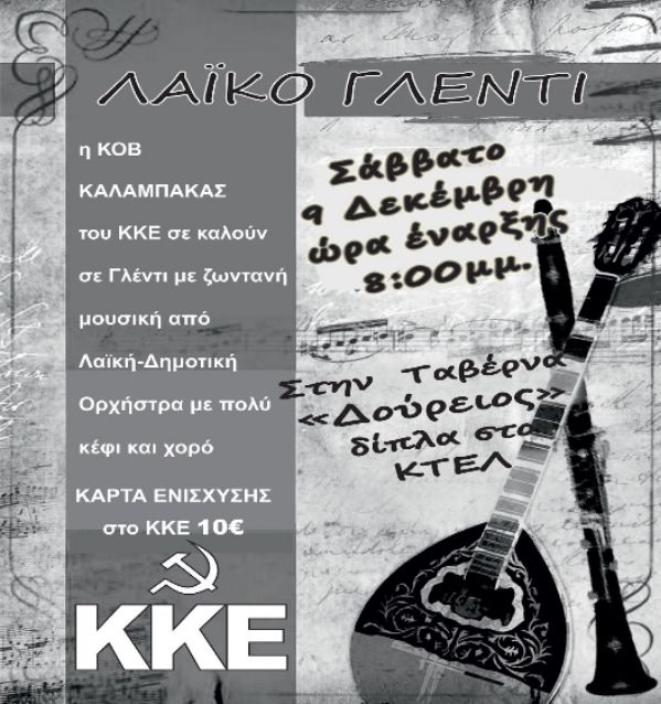 Η ΚΟΒ Καλαμπάκας του ΚΚΕ διοργανώνει λαϊκό γλέντι για την οικονομική ενίσχυση του κόμματος στα πλαίσια της δίμηνης Οικονομικής Εξόρμησης για τους μήνες Νοέμβρη-Δεκέμβρη που έχει προκυρηξει η Κ.Ε. του ΚΚΕ.