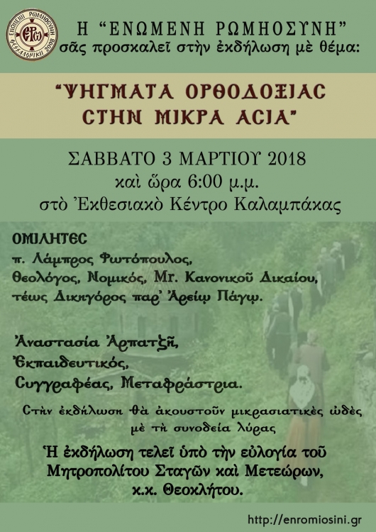 Η “Ενωμένη Ρωμηοσύνη” σας προσκαλεί στην εκδήλωση με θέμα: “Ψήγματα Ορθοδοξίας στην Μικρά Ασία”  που θα γίνει το Σάββατο 3 Μαρτίου και ώρα 18:00 το απόγευμα στο Πολιτιστικό Κέντρο Καλαμπάκας.