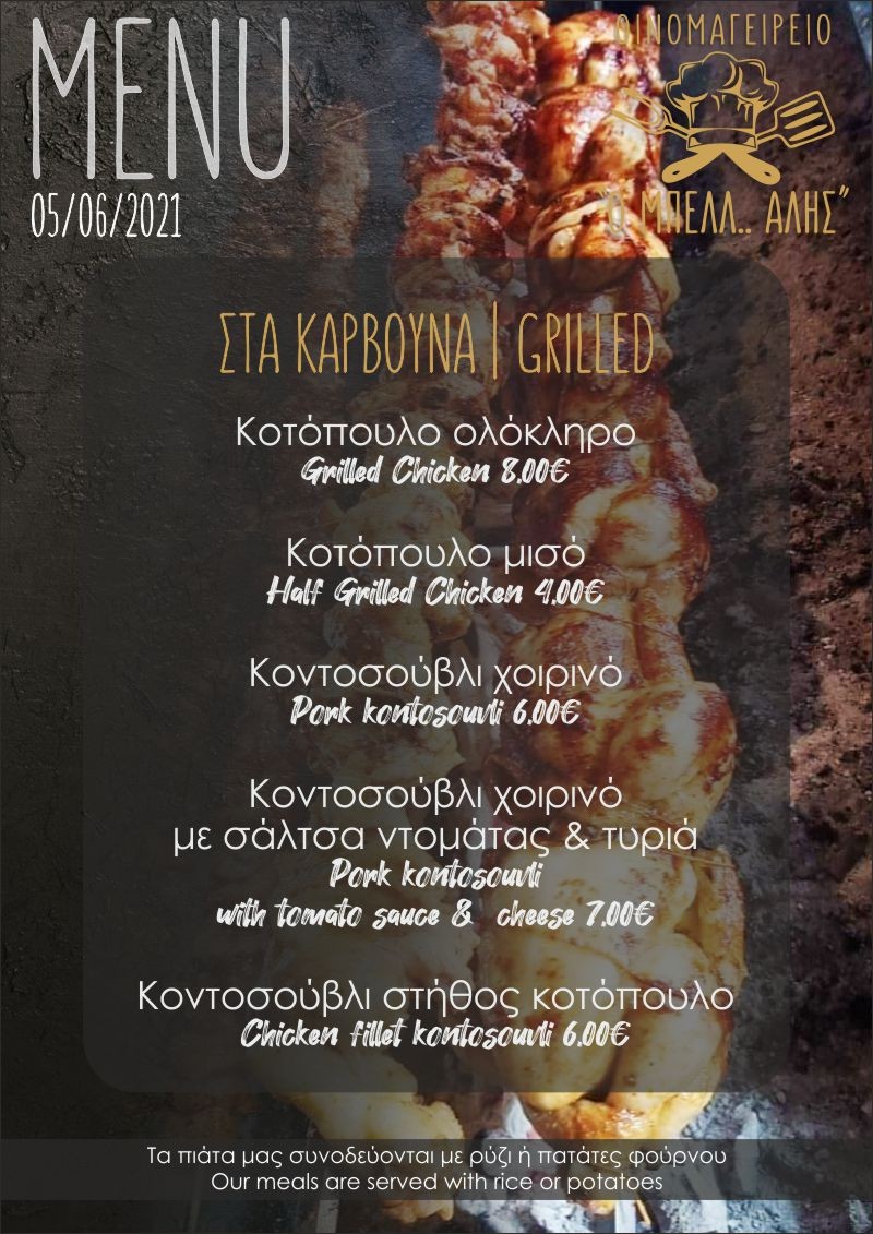 Το Οινομαγειρείο “Ο ΜΠΕΛΛ.. ΑΛΗΣ” της Καλαμπάκας με το ποιοτικό φαγητό και τις ξεχωριστές του προτάσεις είναι και σήμερα κοντά σας με ειδικά διαμορφωμένο μενού!