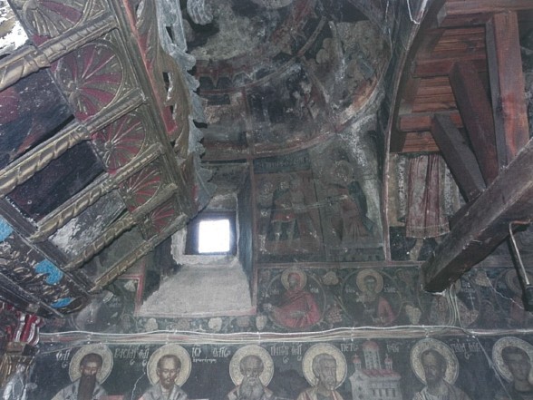– αποκατάσταση θολοδομίας και επιστέγασης (αρμολόγημα εξωτερικής παρειάς, πλήρωση με διαβαθμισμένα αδρανή, εφαρμογή κεκλιμένου διαφράγματος με τσιμεντοκονία και χιαστί πλέγμα στον κυρίως ναό, αντικατάσταση ξύλινου φορέα στέγης στον περιμετρικό διάδρομο, εφαρμογή επικάλυψης με λιθόπλακες)