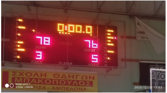 Χαραλαμπίδης 7 (0/0β. 2/3δ. 1/1τρ. 4ρ. 1λ.) Στεφανίδης 13 (1/2β. 0/1δ. 4/6τρ. 5ρ. 1λ.), Πούλιος 10 (0/2β. 5/8δ. 0/0τρ. 4ρ. 3λ. 1κλ.), Χλωρός 17 (0/0β. 3/6δ. 3/3τρ. 1ρ. 3λ. 1κλ.), Γκούμας Κ. –αρχ.  12 (0/1β. 6/11δ. 0/1τρ. 6ρ. 1κλ. 1κοψ. 1λ.) (starting lineup), Σιούτας Θ.14 (3/5β. 1/9δ. 3/12τρ. 3λ. 1ρ.) Κολώνας 3 (3/4β. 0/1δ. 0/0τρ. 5ρ.1κοψ.)