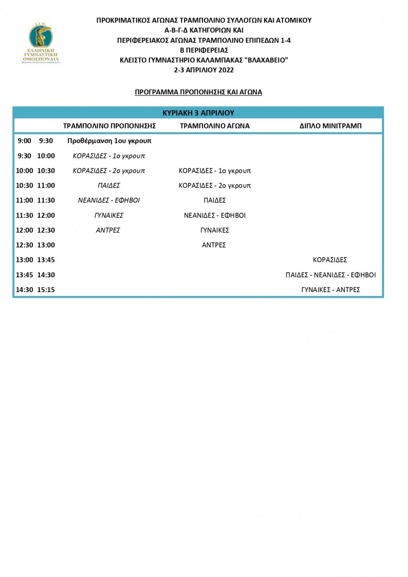 Στο Κλειστό Βλαχάβειο Γυμναστήριο διεξάγονται σήμερα από το μεσημέρι έως το βράδυ οι προπονήσεις των αθλητών από συλλόγους που θα πάρουν μέρος στους ΠΡΟΚΡΙΜΑΤΙΚΟΥΣ ΑΓΩΝΕΣ ΤΡΑΜΠΟΛΙΝΟ ΣΥΛΛΟΓΩΝ ΚΑΙ ΑΤΟΜΙΚΟΥ Α-Β-Γ-Δ ΚΑΤΗΓΟΡΙΩΝ ΚΑΙ ΠΕΡΙΦΕΡΕΙΑΚΟΥ ΑΓΩΝΑ ΤΡΑΜΠΟΛΙΝΟ ΕΠΙΠΕΔΩΝ 1-4 Β ΠΕΡΙΦΕΡΕΙΑΣ του Σαββάτου και της Κυριακής.