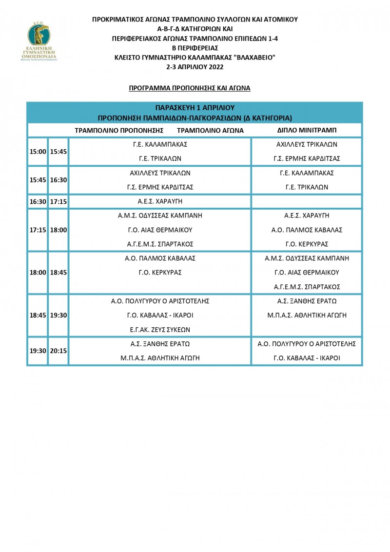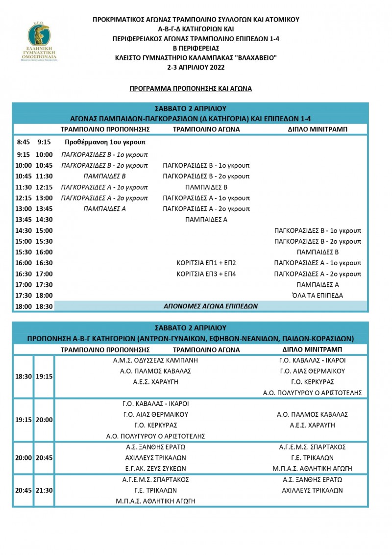 Στο Κλειστό Βλαχάβειο Γυμναστήριο διεξάγονται σήμερα από το μεσημέρι έως το βράδυ οι προπονήσεις των αθλητών από συλλόγους που θα πάρουν μέρος στους ΠΡΟΚΡΙΜΑΤΙΚΟΥΣ ΑΓΩΝΕΣ ΤΡΑΜΠΟΛΙΝΟ ΣΥΛΛΟΓΩΝ ΚΑΙ ΑΤΟΜΙΚΟΥ Α-Β-Γ-Δ ΚΑΤΗΓΟΡΙΩΝ ΚΑΙ ΠΕΡΙΦΕΡΕΙΑΚΟΥ ΑΓΩΝΑ ΤΡΑΜΠΟΛΙΝΟ ΕΠΙΠΕΔΩΝ 1-4 Β ΠΕΡΙΦΕΡΕΙΑΣ του Σαββάτου και της Κυριακής.