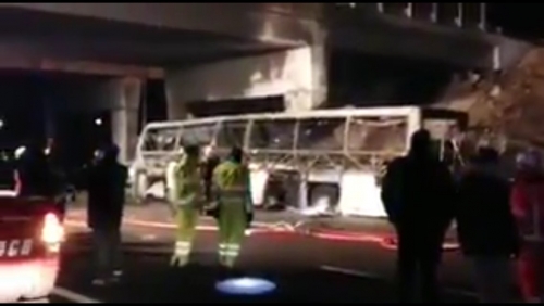 Η πυροσβεστική ανέφερε στον λογαριασμό της στο Twitter ότι το λεωφορείο τυλίχθηκε στις φλόγες μετά την πρόσκρουση. «Υπάρχουν πολλά θύματα», πρόσθεσε.