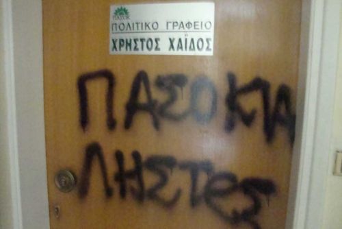 Άγνωστοι έγραψαν συνθήματα στις πόρτες των Πολιτικών τους Γραφείων δείχνοντας για ακόμα μια φορά την αγανάκτησή τους για όσα συμβαίνουν.