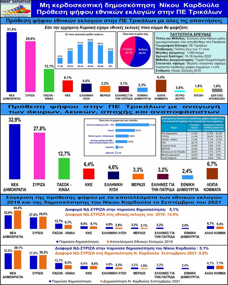 Η έρευνα απευθύνθηκε τυχαία στους 60.000 χρήστες του Facebook της ΠΕ Τρικάλων ηλικίας άνω των 17 ετών, μέσω ερωτηματολογίου με πληρωμένη δική μου διαφήμιση, από 15 έως 18 Ιουλίου 2022 και κατόπιν στάθμισης των πρωτογενών δεδομένων βάσει των ηλικιών και των εθνικών εκλογών 2019, τα αποτελέσματά της ήταν: